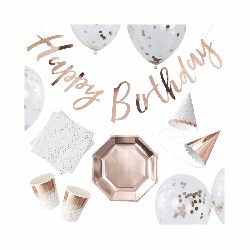 Kit complet de décoration rose gold pour anniversaire incluant assiettes, gobelets, serviettes, ballons confettis, guirlande et chapeaux de fête.