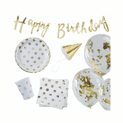 Set de décoration d’anniversaire doré incluant assiettes, gobelets, serviettes, ballons confettis, chapeau de fête et guirlande.