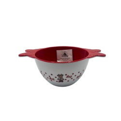 Bol Disney Minnie avec poignées en forme d’oreilles et décor de nœuds rouges. Pratique et adorable pour petits-déjeuners magiques.