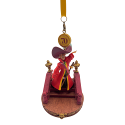 Ornement Disney 70e anniversaire Peter Pan, représentant le héros volant sur le pont du navire, suspendu par un ruban doré, détails raffinés et colorés.